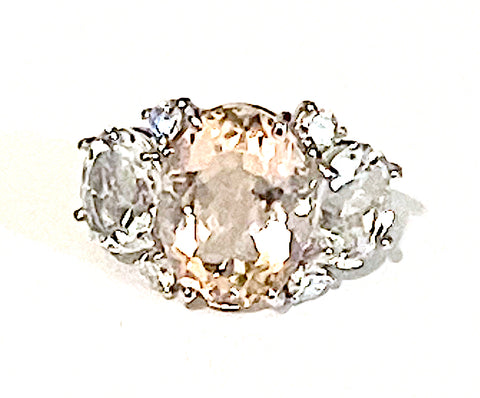 Custom Platinum Three stone Ring with center faceted oval Morganite weighing approximately 8.00 cts with two oval faceted Rock Crystal weighing approximately 3.00 cts each accented with four round brilliant Diamonds weighing approximately 0.60cts total weight.